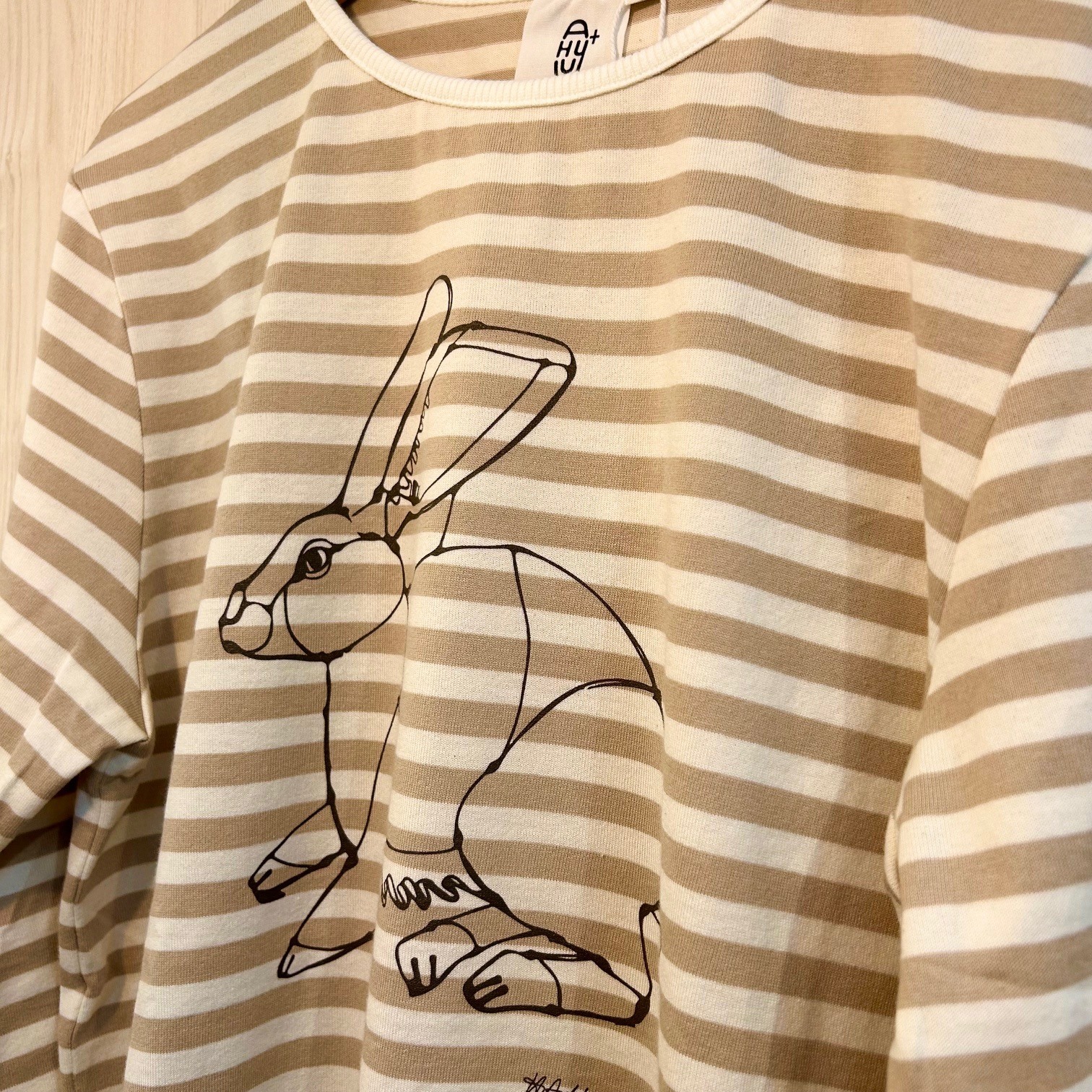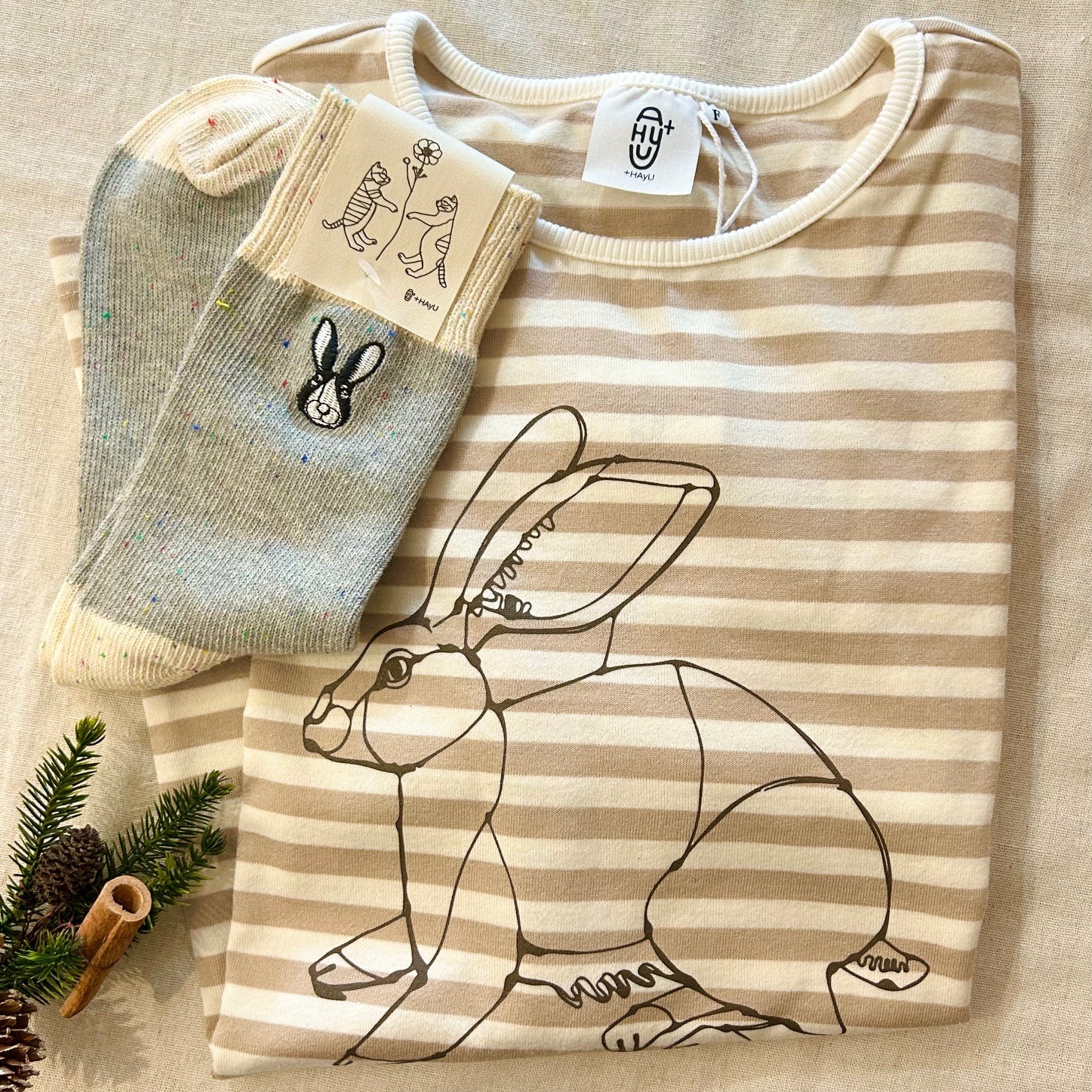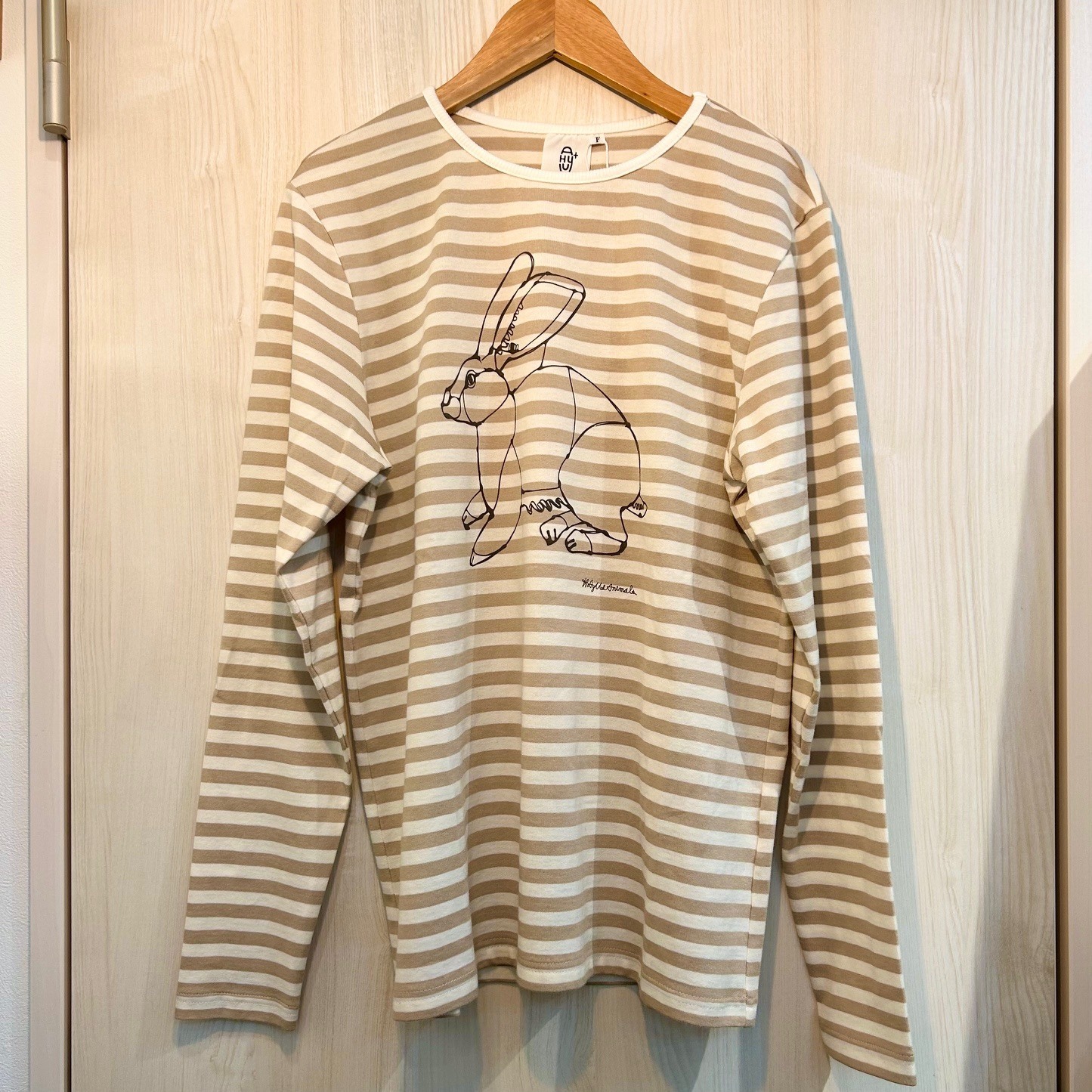 やさしいボーダー柄のロンTには、+HAyUらしい繊細なラインアートで描かれた“うさぎ”のデザインをプリント。肌触りが良く、どんなスタイルにも合わせやすい一枚です。