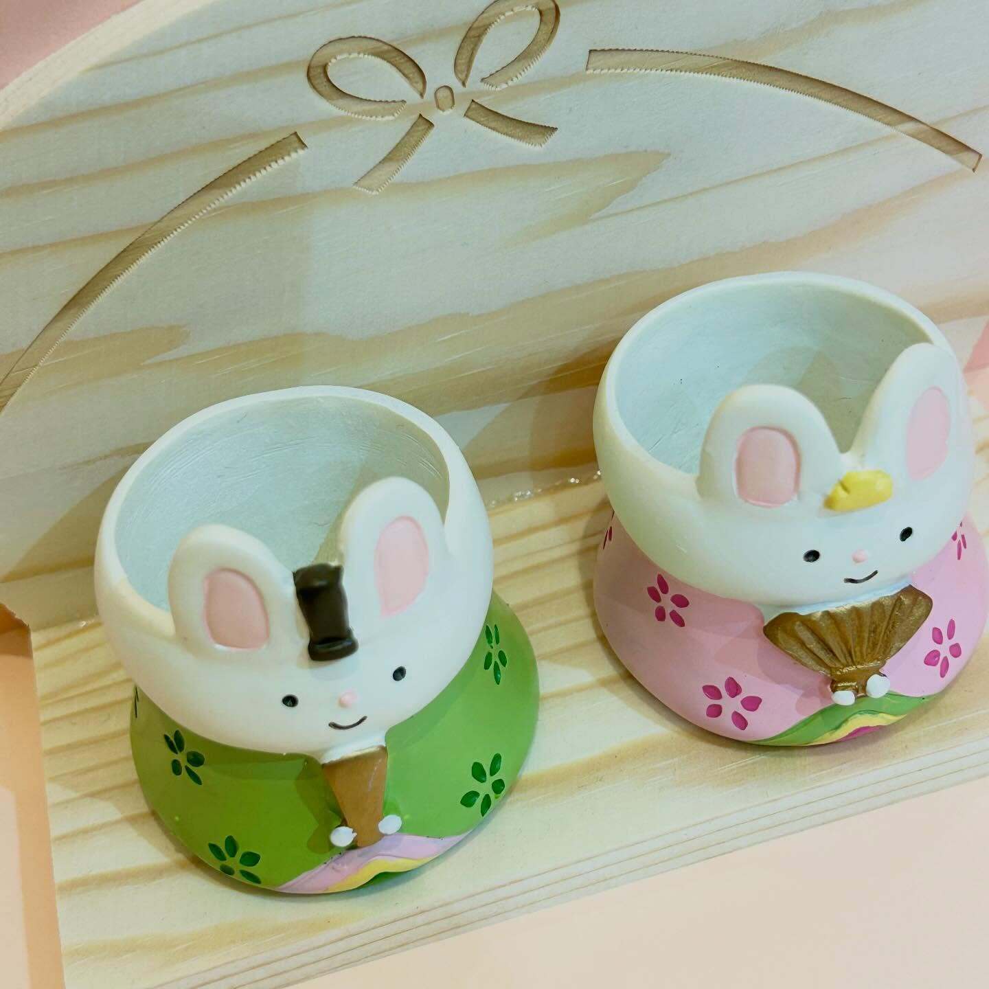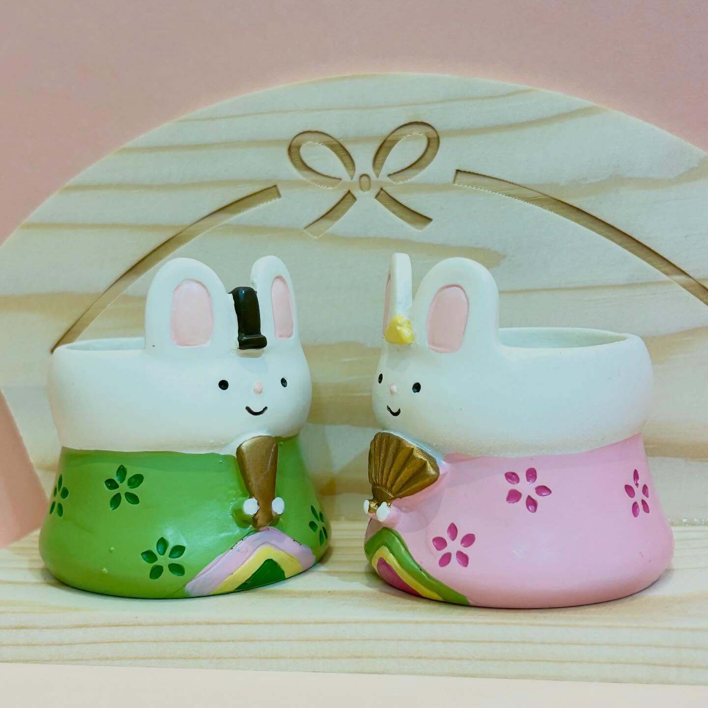 愛くるしい表情…ひな祭りにぴったりの、うさぎさんのレジンポットが入荷しました お花を活けても、そのまま飾っても可愛く楽しめます♪ リボンの彫刻が入ったナチュラルな木の台とセットで飾るのがおすすめです