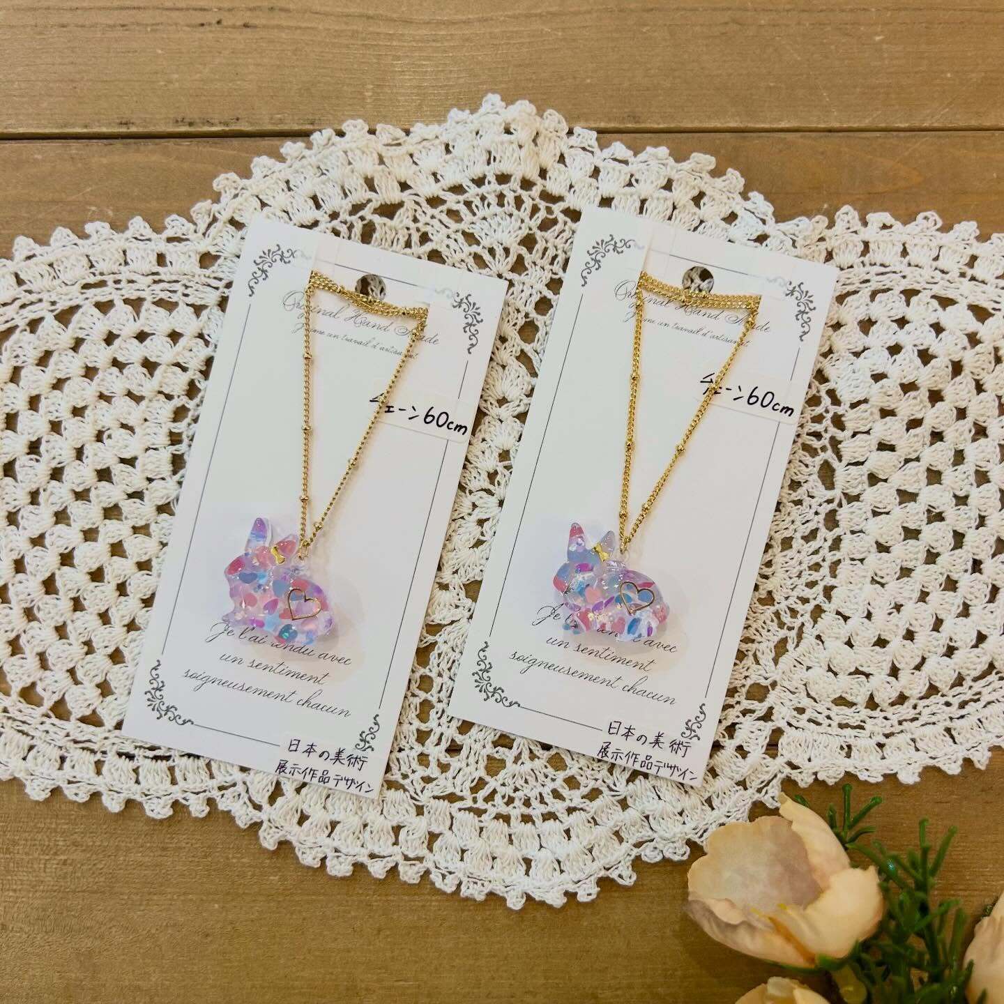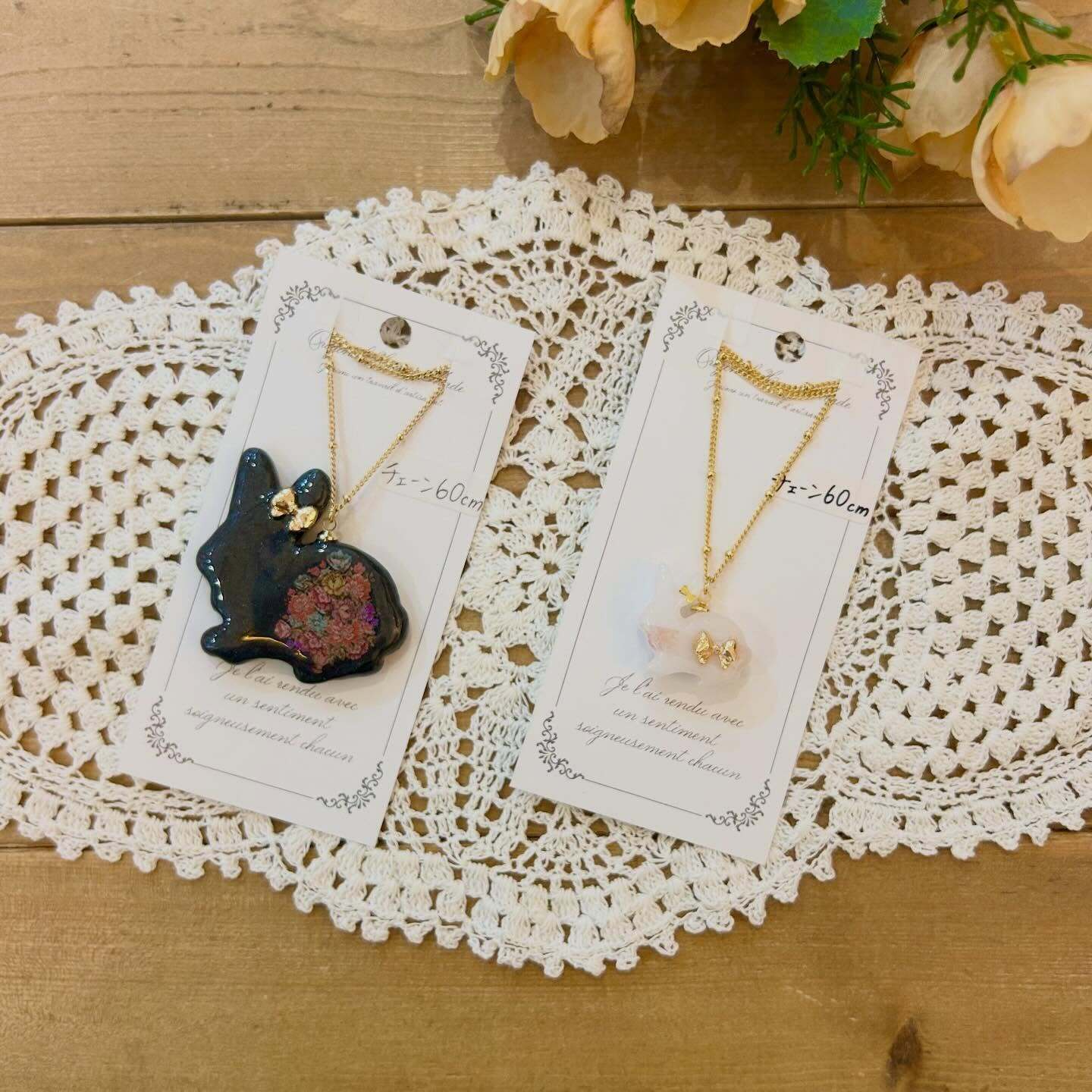 シックな黒うさぎさんや、愛らしいダッチ柄うさぎさんのネックレスやリングには可憐なお花が咲き、細部まで丁寧に作り込まれています。ゴールドのリボンがきらりと輝き、さりげない存在感を放ちます。