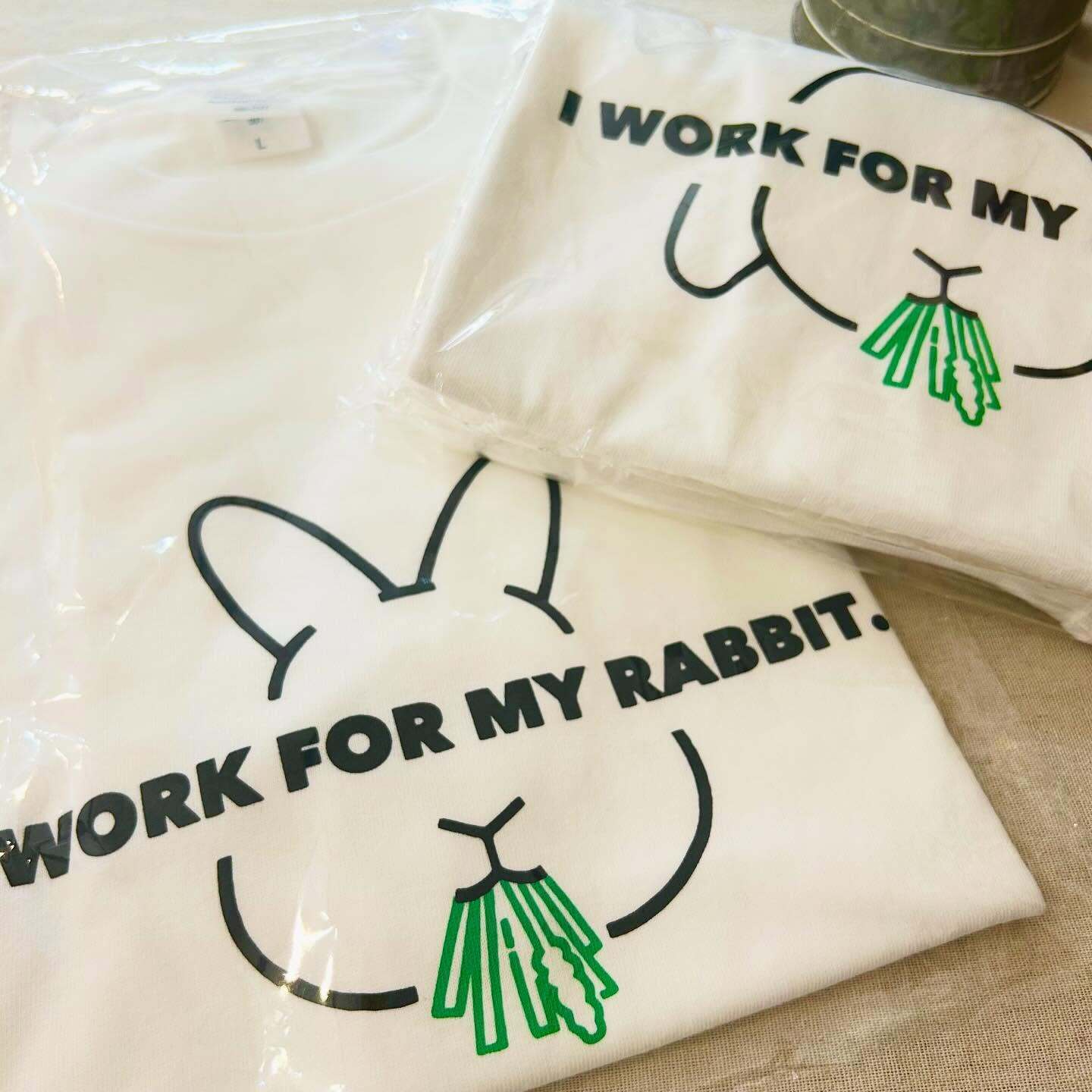 これからの暑い季節にぴったり 「ウサギノシモベ」さんのTシャツが入荷しました 英語のメッセージは 「I WORK FOR MY RABBIT.」 =「うさぎのために働いています!」 うさぎさん好きなら、さらっと着こなせる一枚♪ この夏の相棒にいかがでしょうか?